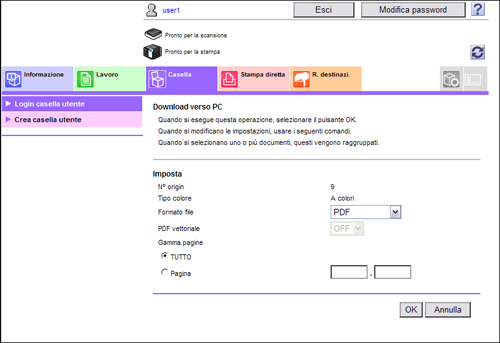 Utilizzando Web Connection è possibile scaricare su un computer i file contenuti nella casella utente pubblica. Per informazioni dettagliate, fare riferimento a Qui.