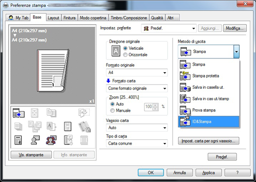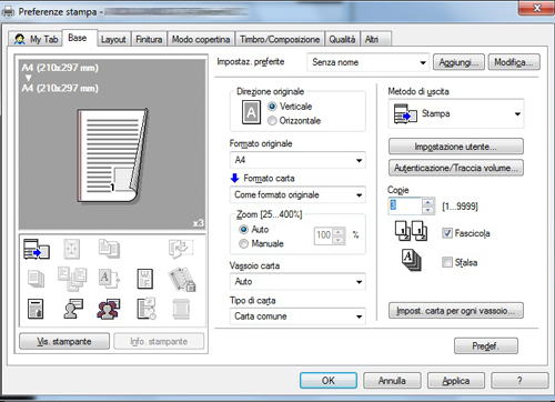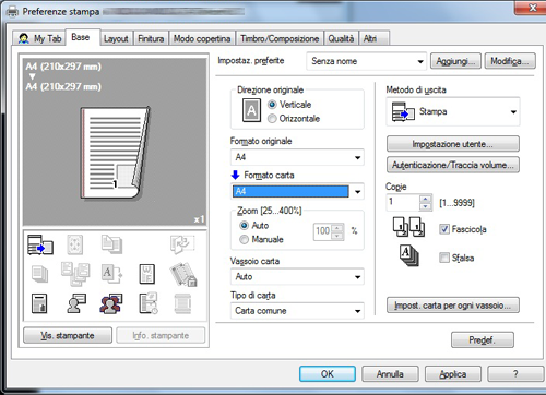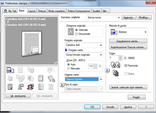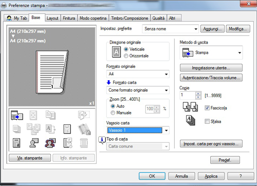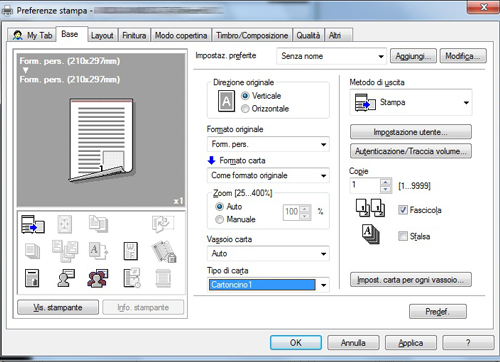 In [Tipo di carta] all'interno della scheda [Base], selezionare il tipo di carta per la stampa. Questa funzione è attivata quando [Vassoio carta] è impostato su [Auto].