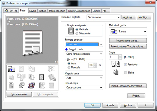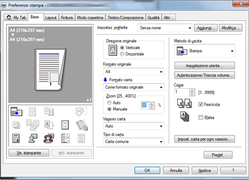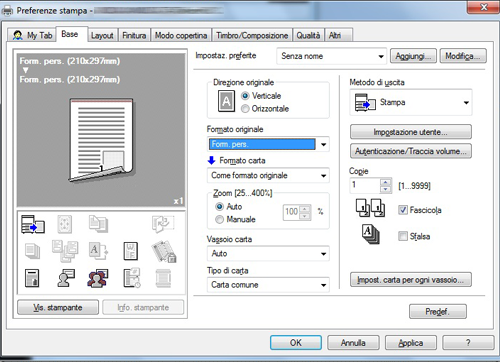In [Formato carta] all'interno della scheda [Base], selezionare il formato carta per la stampa. Il valore zoom viene determinato automaticamente in base ai formati carta selezionati in [Formato originale] e [Formato carta].