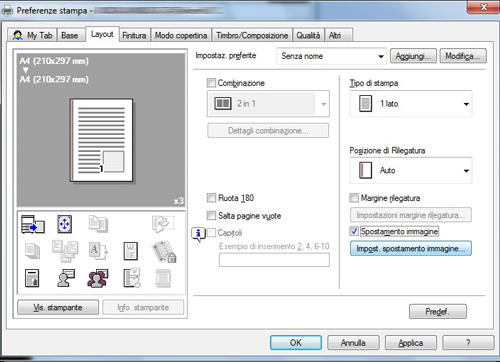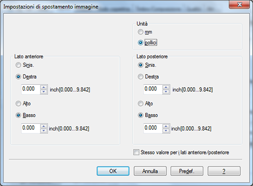 Utilizzare questa funzione per eseguire una regolazione fine, come modificare leggermente la posizione di stampa o stampare immagini in posizioni differenti nei lati fronte e retro.