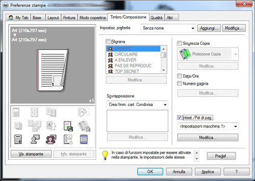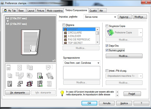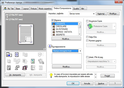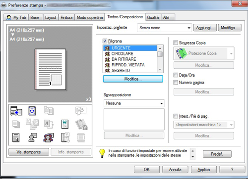 Nella scheda [Timbro/Composizione], selezionare la casella di controllo [Sicurezza Copia], quindi selezionare [Protezione Copia].