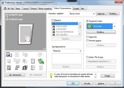 Nella scheda [Timbro/Composizione], selezionare la casella di controllo [Sicurezza Copia], quindi selezionare [Anti-copia].