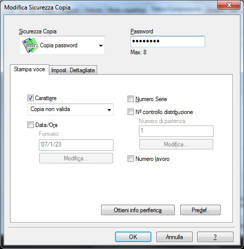 Nella scheda [Timbro/Composizione], selezionare la casella di controllo [Sicurezza Copia], quindi selezionare [Copia password].