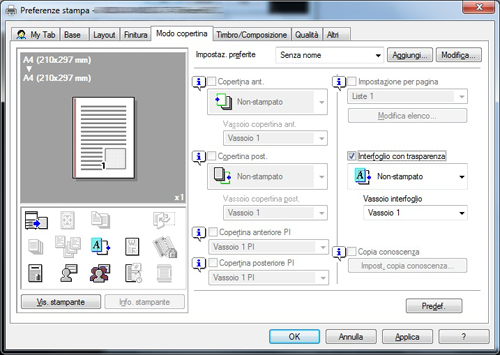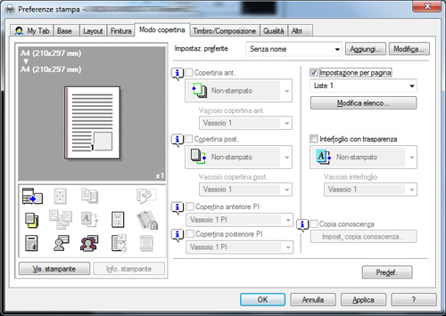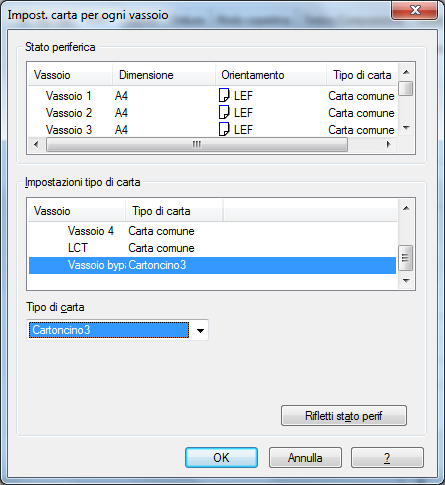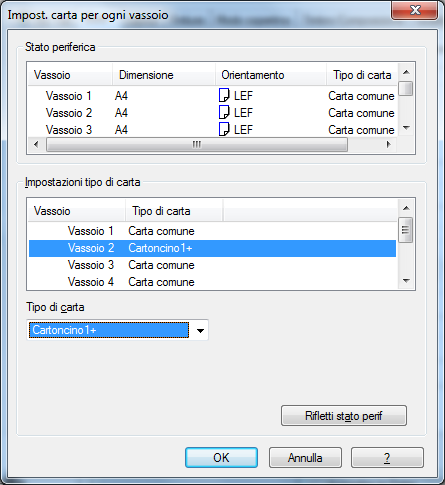 In [Impost. carta per ogni vassoio...] nella scheda [Base], è possibile impostare un tipo di carta per ogni vassoio. Quando si specifica una voce diversa da [Auto] in [Vassoio carta], sono applicate le informazioni sul tipo di carta specificate qui.