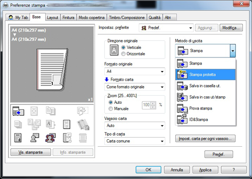 In [Metodo di uscita] sulla scheda [Base], selezionare [Stampa protetta].