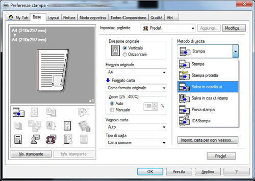 In [Metodo di uscita] nella scheda [Base], selezionare [Salva in casella ut.].