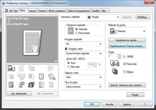 Lo stato in cui l'impostazione di Autenticazione utente/ Traccia account non è stata configurata correttamente, implica che la casella di controllo [Auto] della funzione [Ottieni impostazioni...] è stata azzerata, e la funzione [Autenticazione]/[Traccia volume] delle [Opzioni periferica] è stata impostata su [Nessuno] nella scheda [Configura] della finestra [Proprietà] del driver di stampa. Se un lavoro di stampa viene eseguito in questo stato, selezionando [Stampa] in [Metodo di uscita] della scheda [Base] al momento della stampa, questo lavoro viene considerato come un lavoro di stampa senza le informazioni di autenticazione.