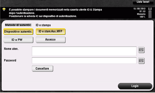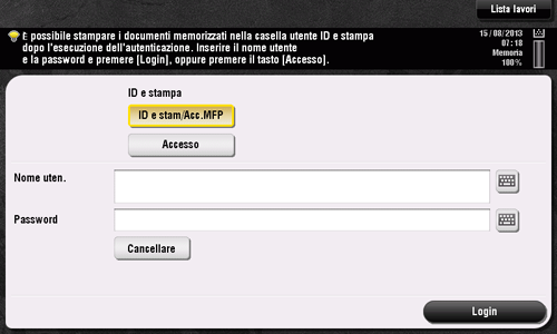 Controllare che [ID e stam/Acc.MFP] sia selezionato in [ID e stampa], e fare clic su [Login].