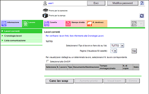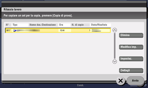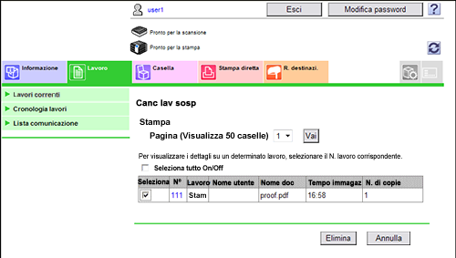 Un lavoro inviato a questa macchina con attivato [Prova stampa], può essere eliminato in remoto utilizzando Web Connection tramite il browser web del computer.