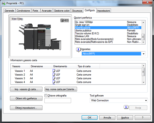 In [Opzioni periferica] nella scheda [Configura], verificare che l'impostazione dell'Autenticazione/Traccia volume (E.K.C.) sia configurata correttamente per l'ambiente operativo.