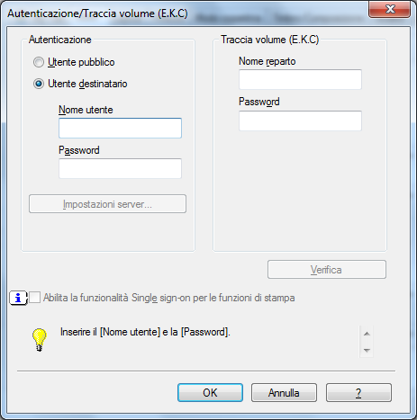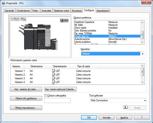 Nella scheda [Configura] del driver di stampa, verificare la correttezza delle impostazioni dell'Autenticazione e Accesso singolo.