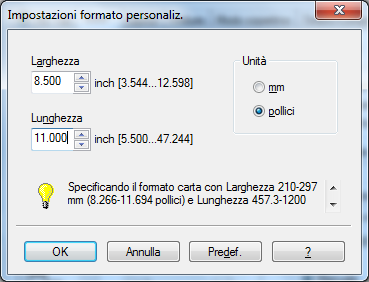 Quando si usa il driver PCL, è possibile registrare un formato personalizzato nella scheda [Impostazioni]. Per informazioni dettagliate sulla scheda [Impostazioni], fare riferimento a Qui.