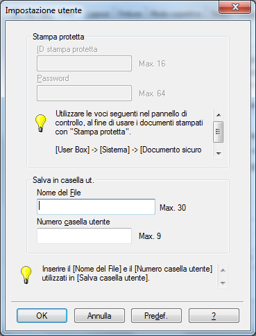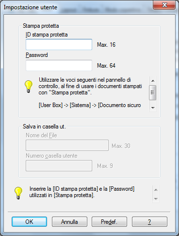 I dati stampati con la funzione Stampa protetta sono salvati nella Casella documenti riservati. Per stampare i dati salvati, occorre inserire l'ID e password specificate nel driver di stampa.