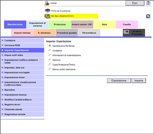 Nel modo amministratore, selezionare [Manutenzione] - [Importa / Esportazione] per selezionare le informazioni da esportare, quindi fare clic su [Esporta].