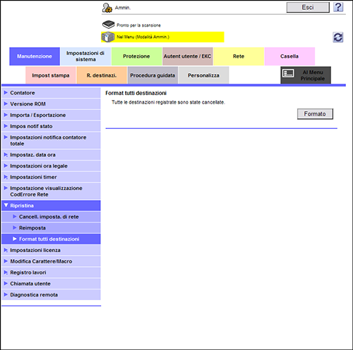 Nel modo amministratore, selezionare [Manutenzione] - [Ripristina] - [Format tutti destinazioni], quindi fare clic su [Formato].