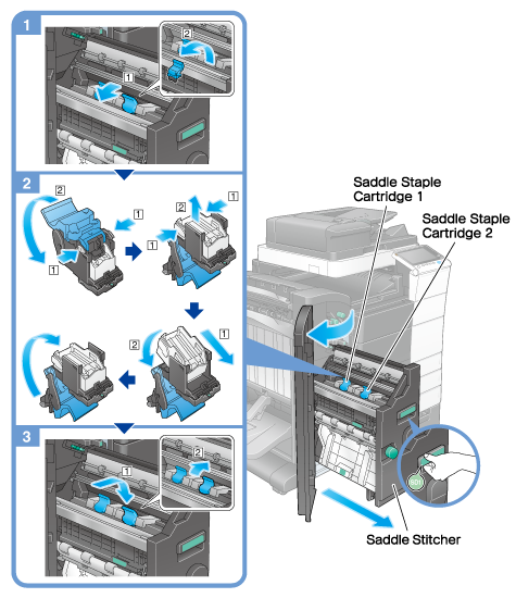 Be sure to replace the Saddle Staple Cartridge after the relevant message has appeared. If a Saddle Staple Cartridge is removed before the relevant message appears, it may result in a failure.
