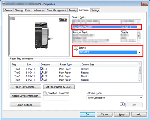 From [Device Option] on the [Configure] tab, select [User Authentication] or [Account Track] and select the target option from [Setting].