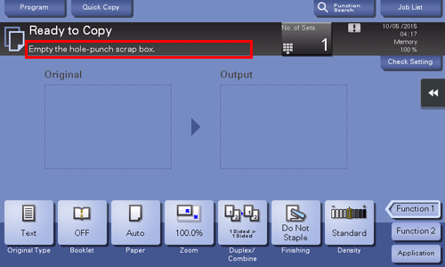 When the punch scrap box is full, a message appears to prompt you to dispose of the punch scraps (at replacement by user).