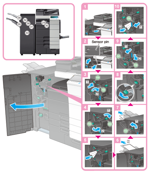 Sections inside the finisher prone to paper jams vary depending on the settings for [Finishing].