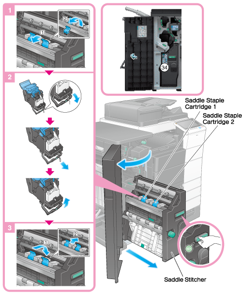 When moving the Saddle Stitcher, be sure to only hold the handle. Otherwise, your hand or finger may get caught in the machine.