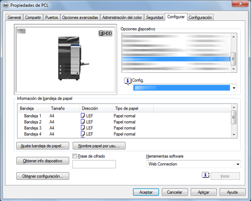 Si la comunicación OpenAPI es cifrada SSL y es posible obtener información del dispositivo de forma automática desde el controlador de impresora, la frase de cifrado puede obtenerse desde esta máquina. Para obtener más información sobre cómo cifrar la comunicación OpenAPI con SSL, consulte Aquí.