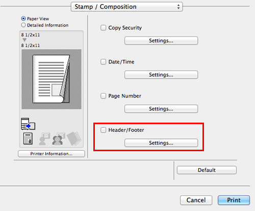 En [Stamp / Composition], seleccione la casilla de verificación [Header/Footer] y, a continuación, haga clic en [Settings...]