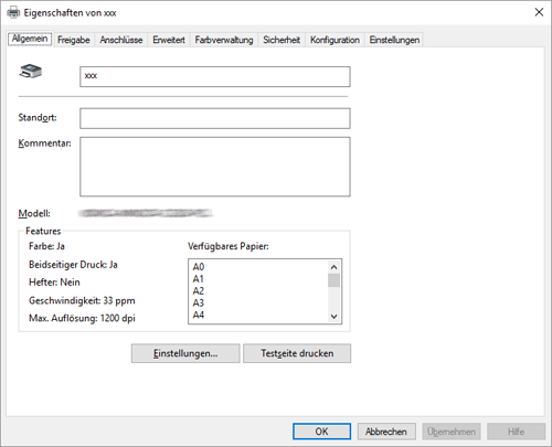 Windows bietet die Testdruckfunktion. Führen Sie einen Testdruck durch, um zu überprüfen, ob der ordnungsgemäße Druck möglich ist.