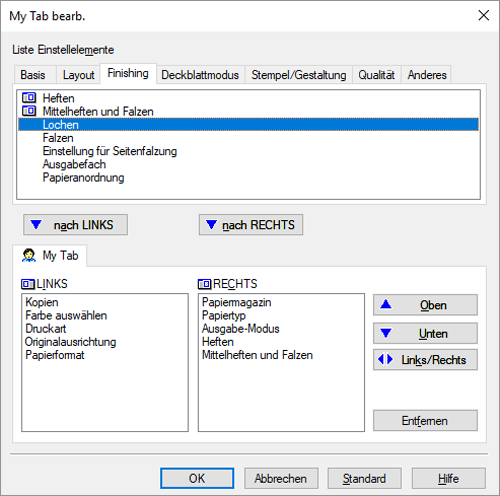 Wenn Sie auf [nach LINKS] klicken, wird die ausgewählte Funktion innerhalb von [My Tab] auf der linken Seite positioniert. Analog dazu wird die Funktion bei einem Klick auf [nach RECHTS] auf der rechten Seite von [My Tab] abgelegt.