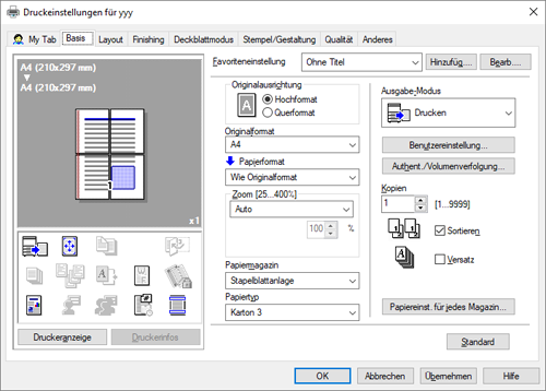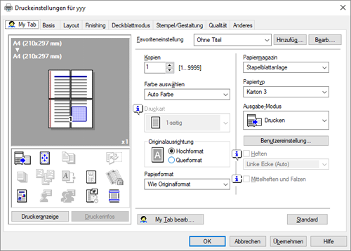 Legen Sie im Fenster [Druckeinstellungen] Druckparameter fest, die Sie als Favorit registrieren möchten.