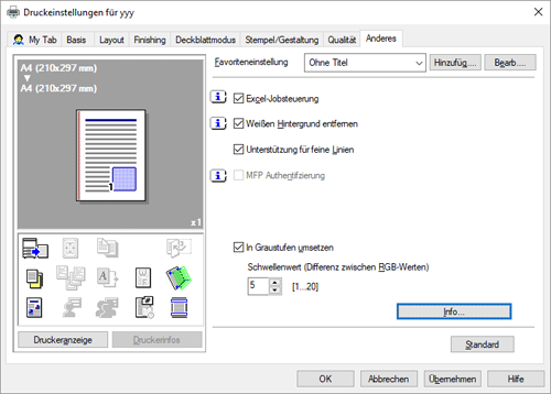 Aktivieren Sie auf der Registerkarte [Andere] das Kontrollkästchen [In Graustufen umsetzen] und legen Sie den Schwellenwert (Unterschiede zwischen den RGB-Werten, bei denen eine Umwandlung in Graustufen erfolgt) fest.