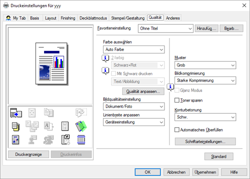 Wenn Sie das Kontrollkästchen [Toner sparen] auf der Registerkarte [Qualität] aktivieren, wird die Druckdichte angepasst, um den Tonerverbrauch zu reduzieren.