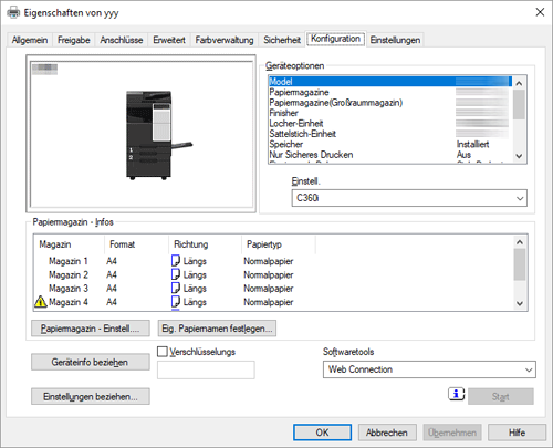 Wenn die OpenAPI-Kommunikation per SSL verschlüsselt ist und die Geräteinformationen automatisch vom Druckertreiber abgefragt werden können, kann das Verschlüsselungskennwort von diesem System abgerufen werden. Ausführliche Informationen zur Verschlüsselung der OpenAPI-Kommunikation per SSL finden Sie Hier.