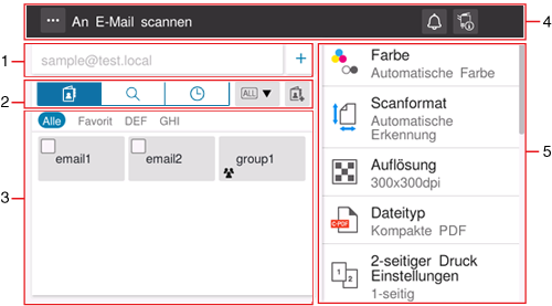 Wenn Sie im Startbildschirm auf [An E-Mail scannen] tippen, wird der Hauptbildschirm der Funktion "An E-Mail scannen" angezeigt.