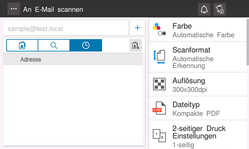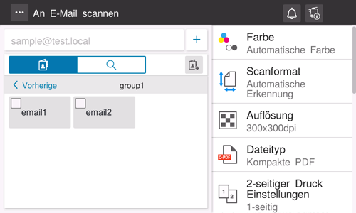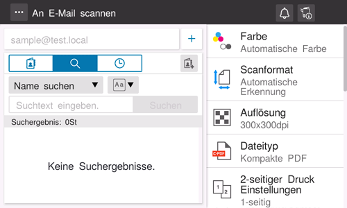 Wenn Sie auf das Suchregister () tippen, wird der Bildschirm für die Zielsuche angezeigt. Wenn der LDAP-Server oder Active Directory von Windows Server für die Benutzerverwaltung verwendet wird, können Sie nach Zielinformationen suchen (LDAP-Suche), die auf dem Server registriert sind, und das gewünschte Ziel auswählen.