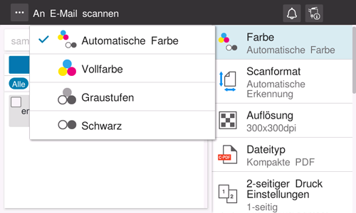 [Auto-Farbe] | Legt beim Scannen des Originals automatisch die Option [Vollfarbe] oder [Graustufen] in Abhängigkeit von der Originalfarbe fest. |