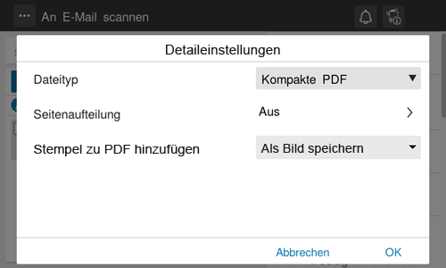 [Strichcode/Vertrag] | Reduziert die Dateigröße beim Scannen eines Originals, wie z. B. eines Vertrags oder eines Strichcodes, in Schwarzweiß. Wenn [Strichcode/Vertrag] ausgewählt wird, wird parallel dazu [Farbe] zu [Schwarzweiß] geändert. Diese Option ist verfügbar, wenn als Dateityp TIFF oder PDF verwendet wird. |