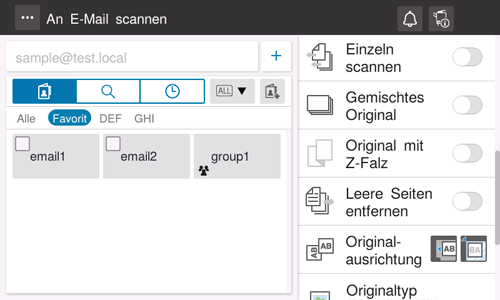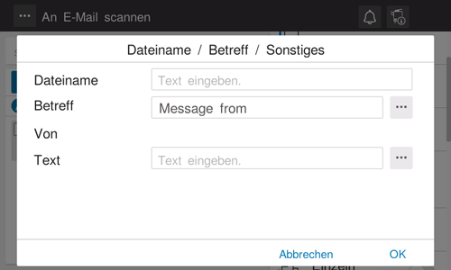 Ändern Sie den Dateinamen des gescannten Originals. Beim E-Mail-Versand können Sie den Betreff und den Text der E-Mail-Nachricht angeben und die E-Mail-Adresse des Absenders (Absenderadresse) ändern.