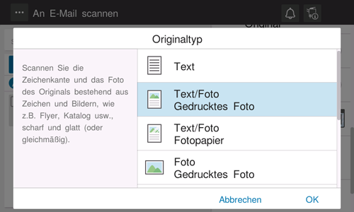 [Foto - Fotopapier] | Scannt ein Original, das nur aus Fotos besteht, mit der optimalen Bildqualitätsstufe. Wählen Sie diese Option zum Scannen eines Originals, das auf Fotopapier gedruckt wurde. |