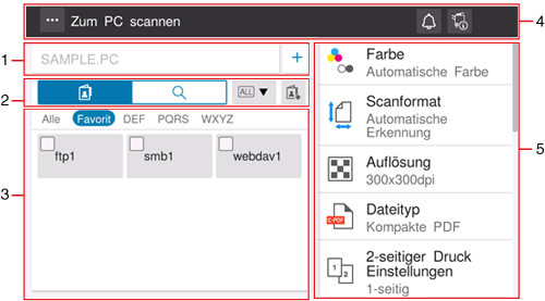 Wenn Sie im Startbildschirm auf [Zum PC scannen] tippen, wird der Hauptbildschirm für den Versand über den PC (SMB/FTP/WebDAV) angezeigt.