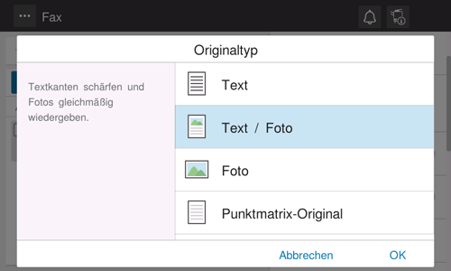 [Text] | Scannt ein Original, das in erster Linie aus Text besteht, mit der optimalen Bildqualitätsstufe. Mit dieser Funktion wird die Schärfe der Kanten aller Zeichen erhöht, um die Erkennbarkeit zu verbessern. |