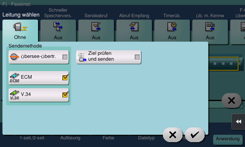 Wenn Sie bei der Registrierung eines Faxziels die Option [Ziel prüfen] auf EIN setzen, wird die Funktion "Ziel prüfen und senden" ausgeführt, bevor ein Fax an das registrierte Ziel gesendet wird. Ausführliche Informationen zur Registrierung eines Faxziels finden Sie Hier.