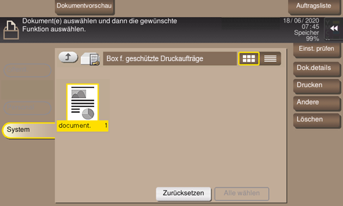 Wenn der einfache Druck für ein geschütztes Druckdokument aktiviert ist, wählen Sie die gewünschte Dokumenten-ID in der Liste der Dokumenten-IDs aus. Ausführliche Informationen über den einfachen Druck finden Sie Hier.