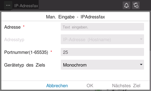 [Gerätetyp des Ziels] | Geben Sie an, ob das Zielsystem den Farbmodus unterstützt (Standard: [Monochrom]). |
