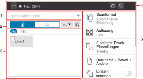 Wenn Sie im Startbildschirm auf [IP Fax (SIP)] tippen, wird der Hauptbildschirm des IP-Adressfaxmdous angezeigt.