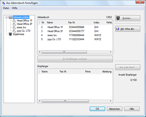 Wählen Sie [Adressbuchliste] in der Liste auf der linken Fensterseite aus, um den gewünschten Empfänger in der Liste [Adressbuch] anzuzeigen.