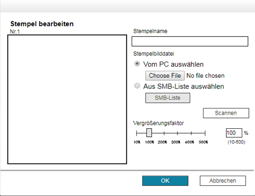 [Vergrößerungsfaktor] | Geben Sie den Zoomfaktor für das Stempelbild an. Der Zoomfaktor kann in Schritten von 1 % angepasst werden. |