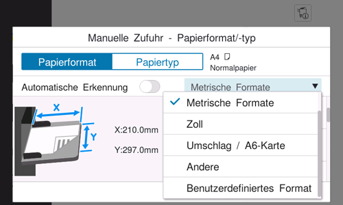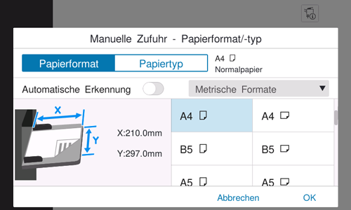 Wenn [Automatische Erkennung] auf EIN eingestellt wird, wird das Format des eingelegten Papiers automatisch erkannt.