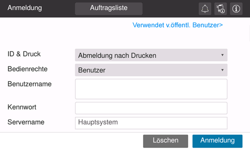 Wenn der öffentliche Benutzerzugriff (für nicht registrierte Benutzer) aktiviert ist, können Sie im Anmeldebildschirm auf [Verwendet v.öffentl. Benutzer] tippen, um dieses System ohne Authentifizierung zu verwenden.