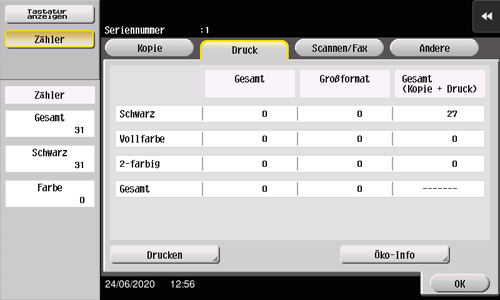[Gesamt] | [Gesamt]: Gibt die Gesamtanzahl der in allen Farbmodi gedruckten Seiten an. [Großformat]: Gibt die Anzahl aller Seiten an, die in allen Farbmodi auf großformatigem Papier gedruckt wurden. |