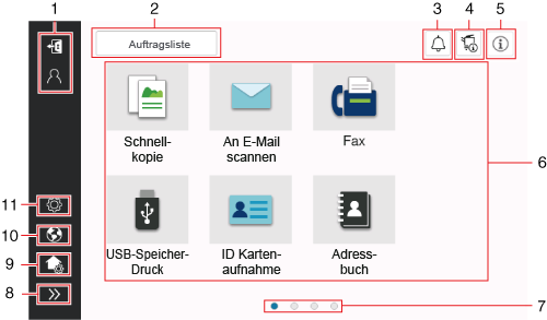 1 | Ben.-/Kostenst.name | Wird angezeigt, wenn die Benutzerauthentifizierung und die Kostenstellenfunktion aktiviert sind. Nach dem Öffnen des linken Bereichs wird der Name des derzeit angemeldeten Benutzers oder der derzeit angemeldeten Kostenstelle angezeigt. Wenn Sie auf |
